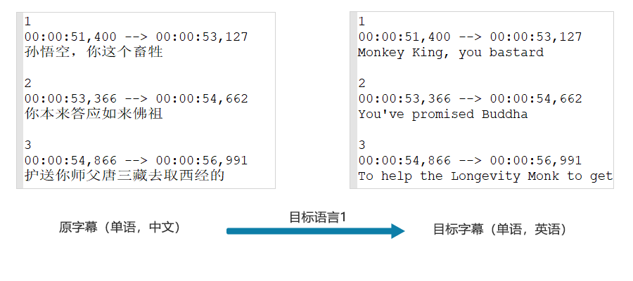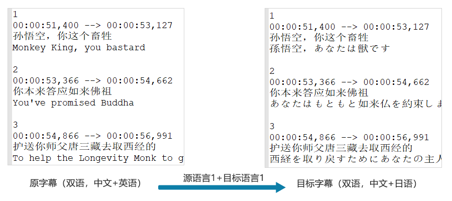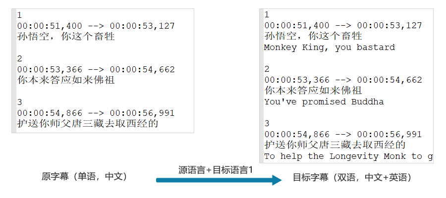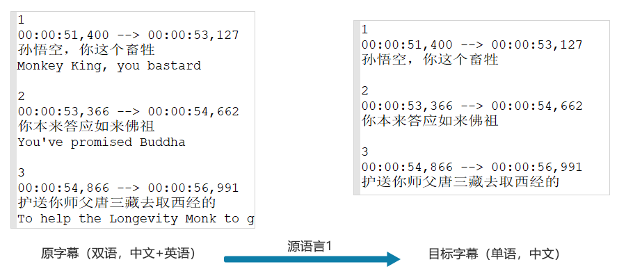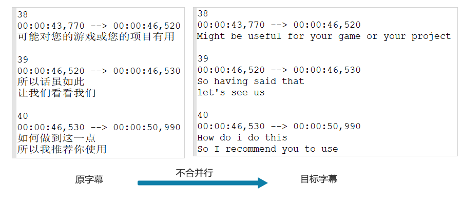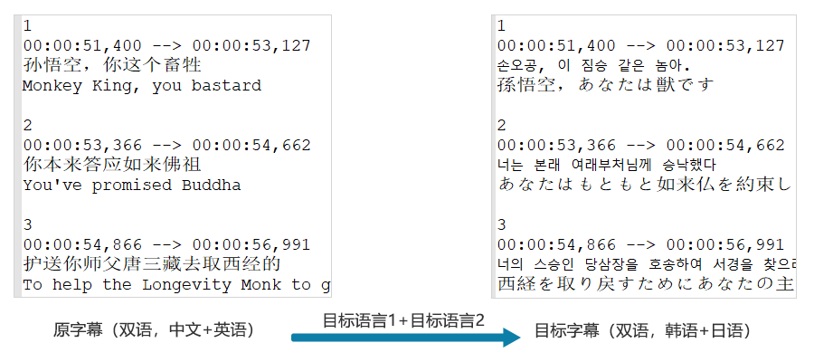 系統(tǒng)允許兩行雙語中存在異常情況,比如個(gè)別的時(shí)間軸只對(duì)應(yīng)一行對(duì)白,這種情況系統(tǒng)會(huì)智能妥善處理。